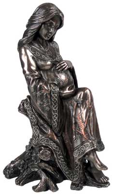 本產品需要付全數訂金訂貨,一般需時約 4-8 星期到貨。A beautiful statue of the Mother aspect of the Goddess, shown here seated comfortably on a wooden stump seat glorying in her full pregnancy; delicate highlights of color are added to accent the bronze undercoating. Cold cast resin.