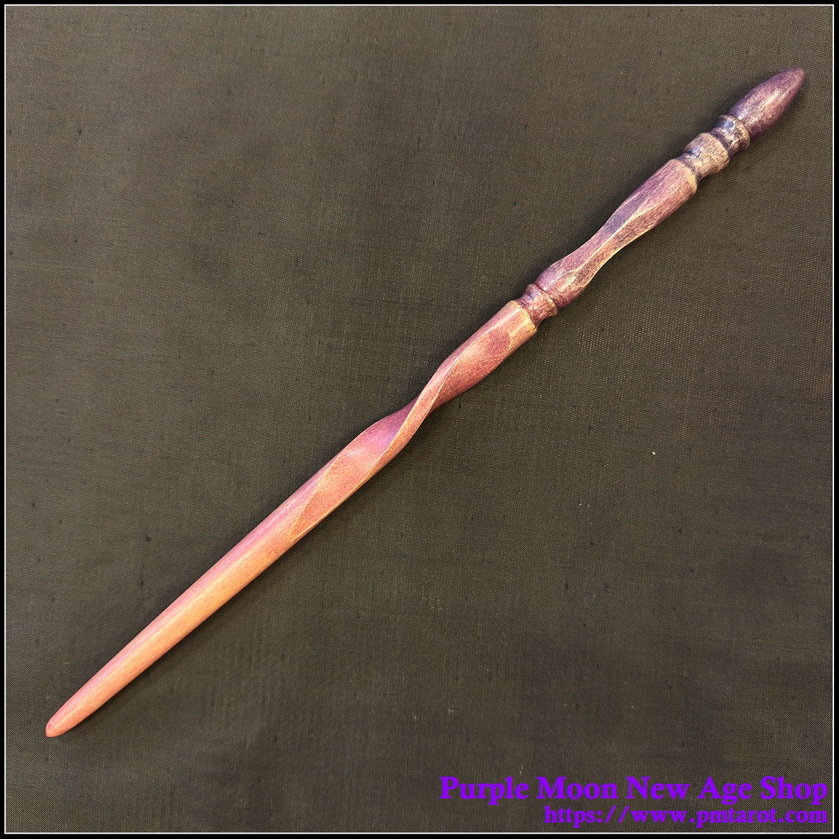 This wand is made from one piece of Birch, making it nice and sturdy for years of spellcasting. The handle has been given a solid dark stain; the tip has had the stain rubbed off, leaving the grain to show through.