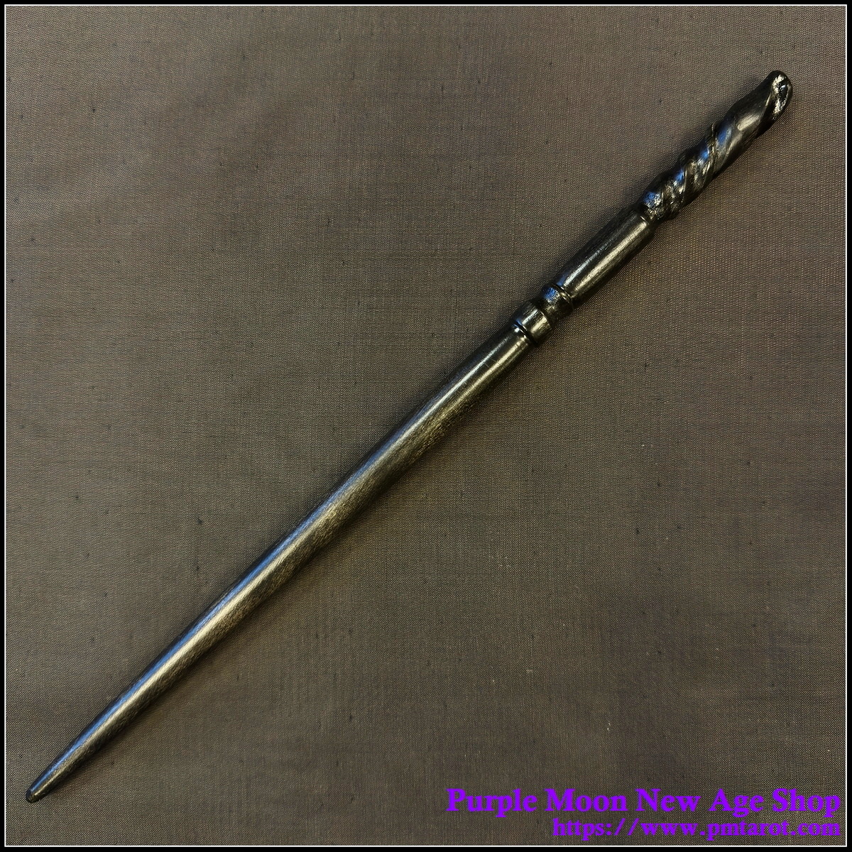 This wand is made from one piece of Birch, making it nice and sturdy for years of spellcasting. The handle has been given a solid dark stain; the tip has had the stain rubbed off, leaving the grain to show through.