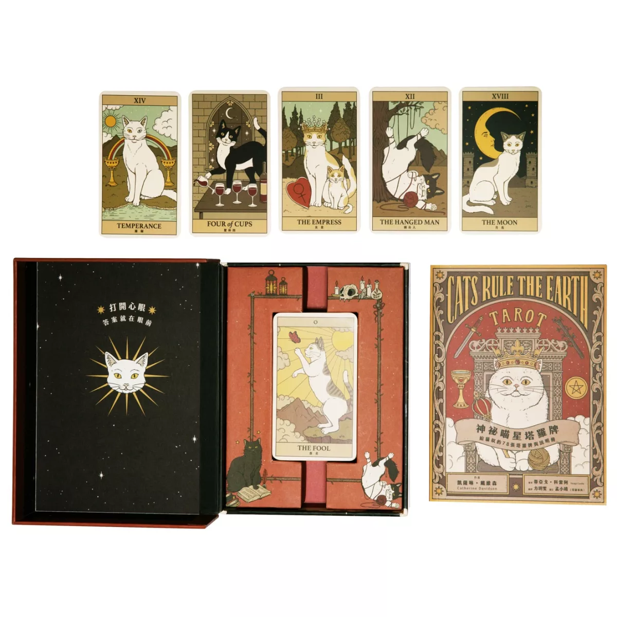 78張塔羅牌展現了神情、身姿各異的萌貓們,觀察牠們的神態,可以從中覺察到每一張卡牌隱藏的諭示,並引導你觸發意想不到的力量。