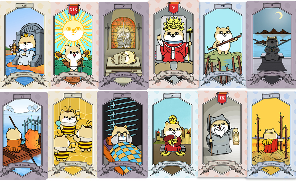 このとても可愛い柴犬タロットを作ったアイデアは、私の家に飼っている一匹の柴犬からきています。ある日、私は突然に、柴犬とタロットと融合すると、どのようなものが生まれるのかと思いついて、ライダータロットでこの可愛い柴犬タロットを作りました。柴犬の可愛さとタロットと完璧に合わせるため、カード一枚一枚に創意工夫を施しました。このタロットのイメージはとても分かりやすく、初心者から長年遊んできたベテランでも簡単に遊べます。