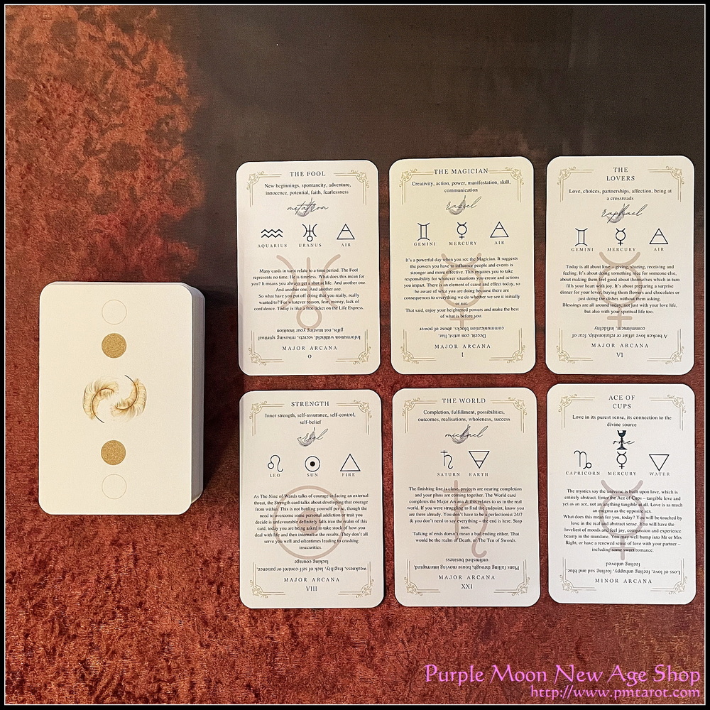這套只有文字及元素符號的牌十分適合初學者。因為每張牌上都印有相關的正逆位關鍵詞,牌的詳細解釋,也有所代表的元素,星座及行星資料。
