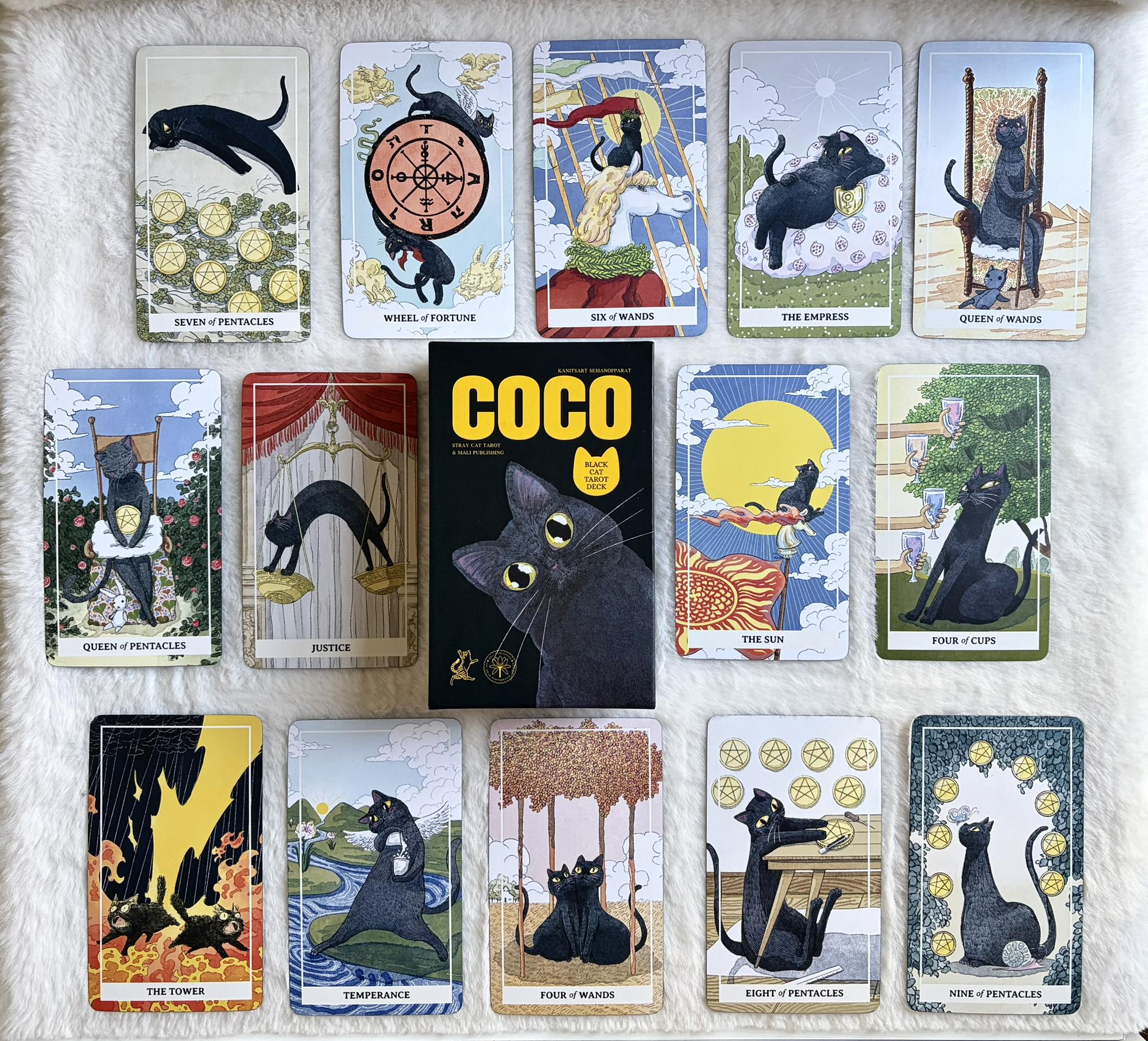 本產品需要付全數訂金訂貨,一般需時約 1-3 星期到貨。Have you ever looked into a cat's eyes and felt they understood more than they let on? Invite that intuitive connection into your sacred space with a truly magical Tarot Deck that purrs with personality. From the gifted artist behind the best-selling Lunalapin Tarot, the Coco Black Cat Tarot is here to add a sprinkle of joy to your daily rituals.