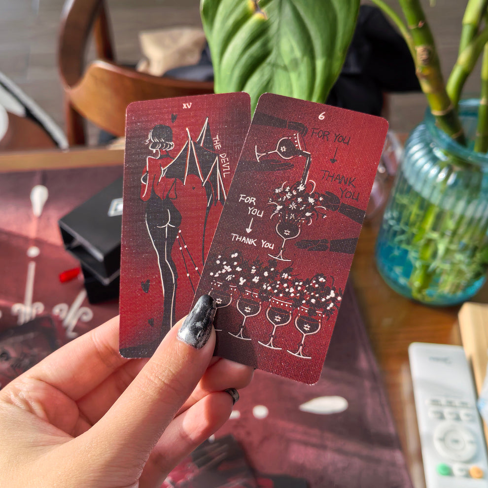 本產品需要付全數訂金訂貨,一般需時約 2-4 星期到貨。Born to disrupt, this deck opens a channel of communication between you and the red-stained unknown, where chaos births new meanings. The cards are painted with raw, spray-textured strokes that evoke woodcut prints, embracing imperfection to reveal deeper truths.