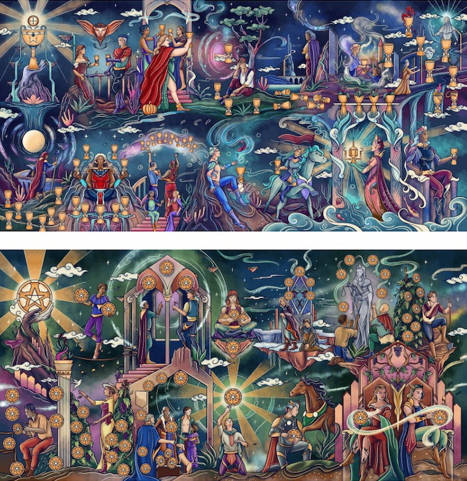 Dreamscapes Tarot,揭開謎團,開始變革性的塔羅體驗。大阿卡納牌和四元素牌結合,創造出令人驚嘆的、統一的圖像,就像一幅大畫報一樣。