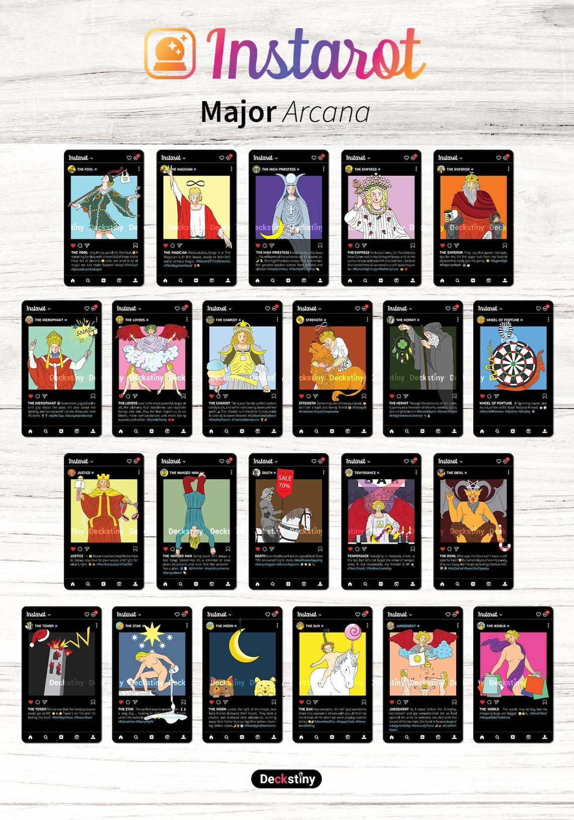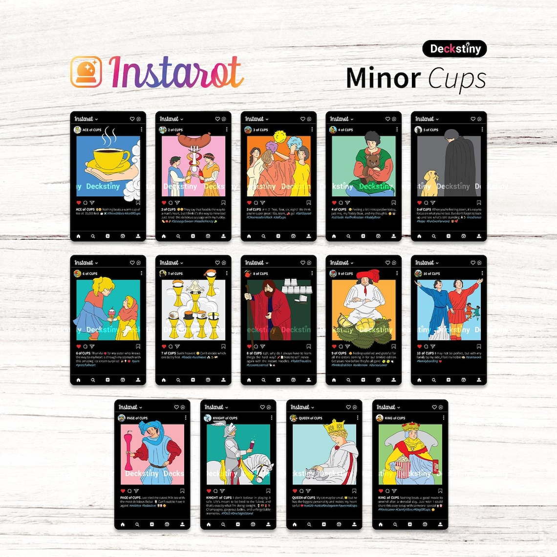 本產品需要付全數訂金訂貨,一般需時約 2 - 8 星期到貨。While the images are based on the classic Rider Waite Smith deck, our deck features updated and playful details, as well as captions under each image. Deckstiny team (Thailand) created the deck with the collaboration of Eugene Leong (Singapore), who contributed to the project as a collaborator. The deck features "Mate Horonumber" as the author and "Oomsin PP" as the artist and creator of the artwork.