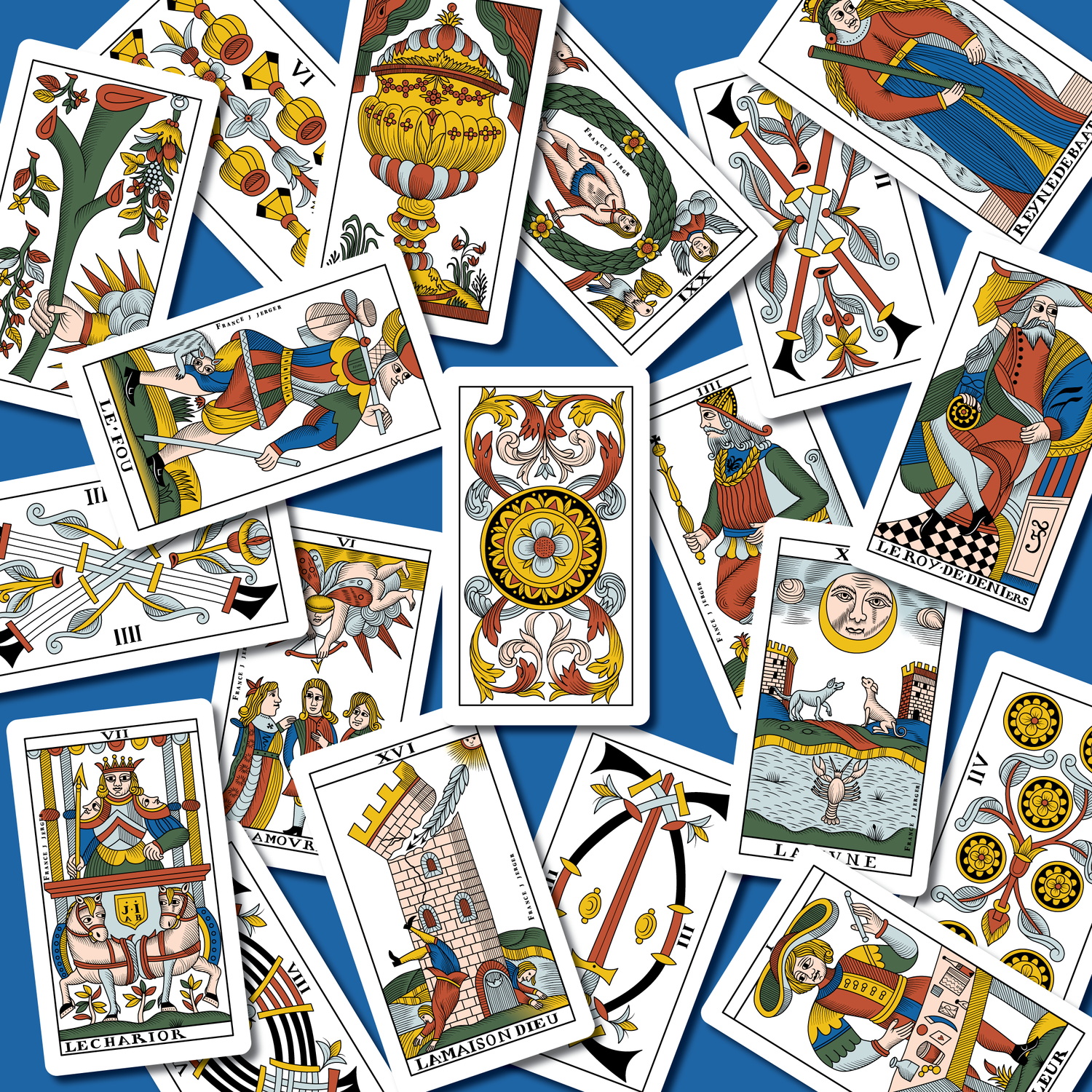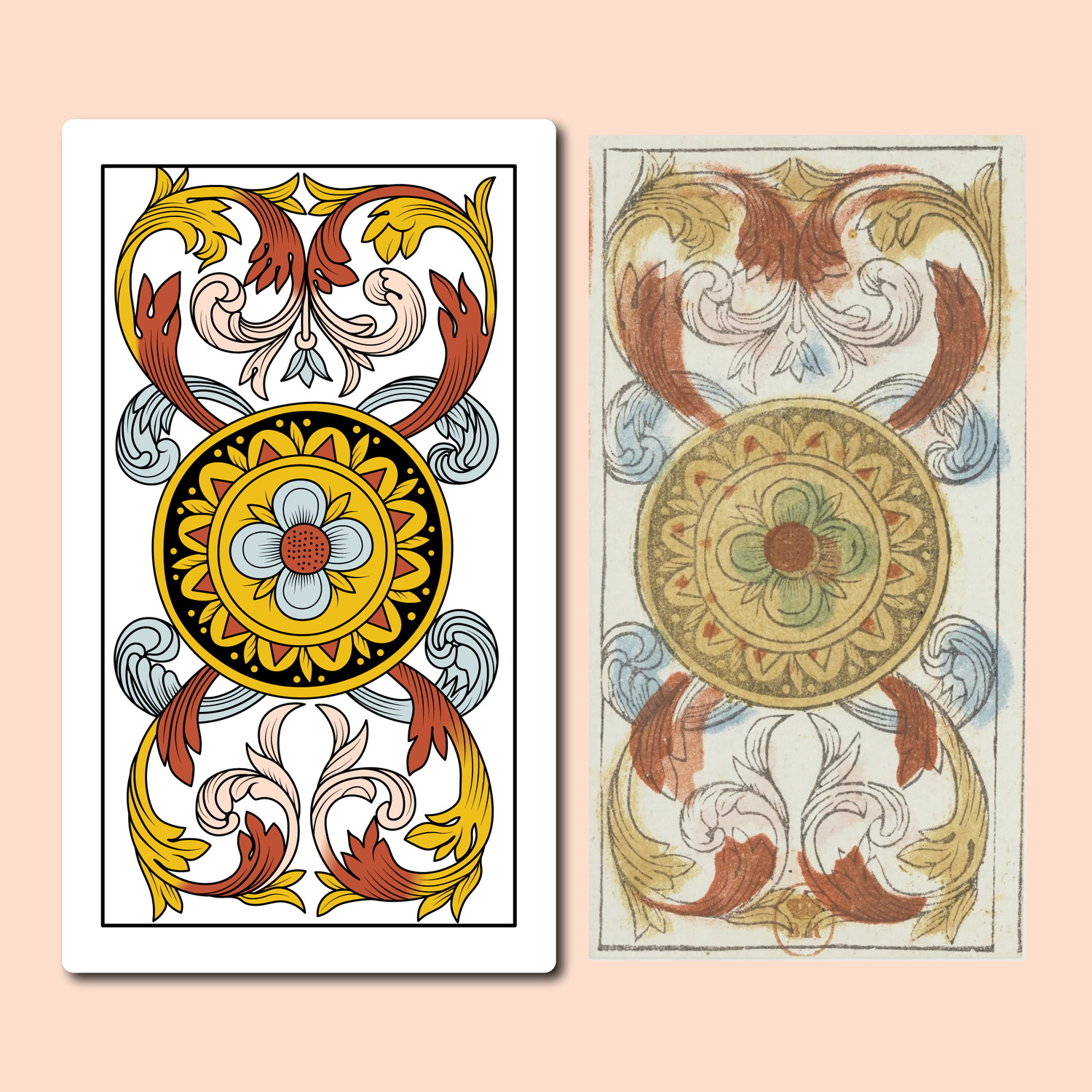This deck was digitally recreated by Krisztina Kondor with the assistance of William Rader. They studied the decks preserved in The National Library of France and researched their history to understand the images. To create consistency, the same color palette was used throughout the deck. The misaligned coloring was corrected, and details were also enhanced.