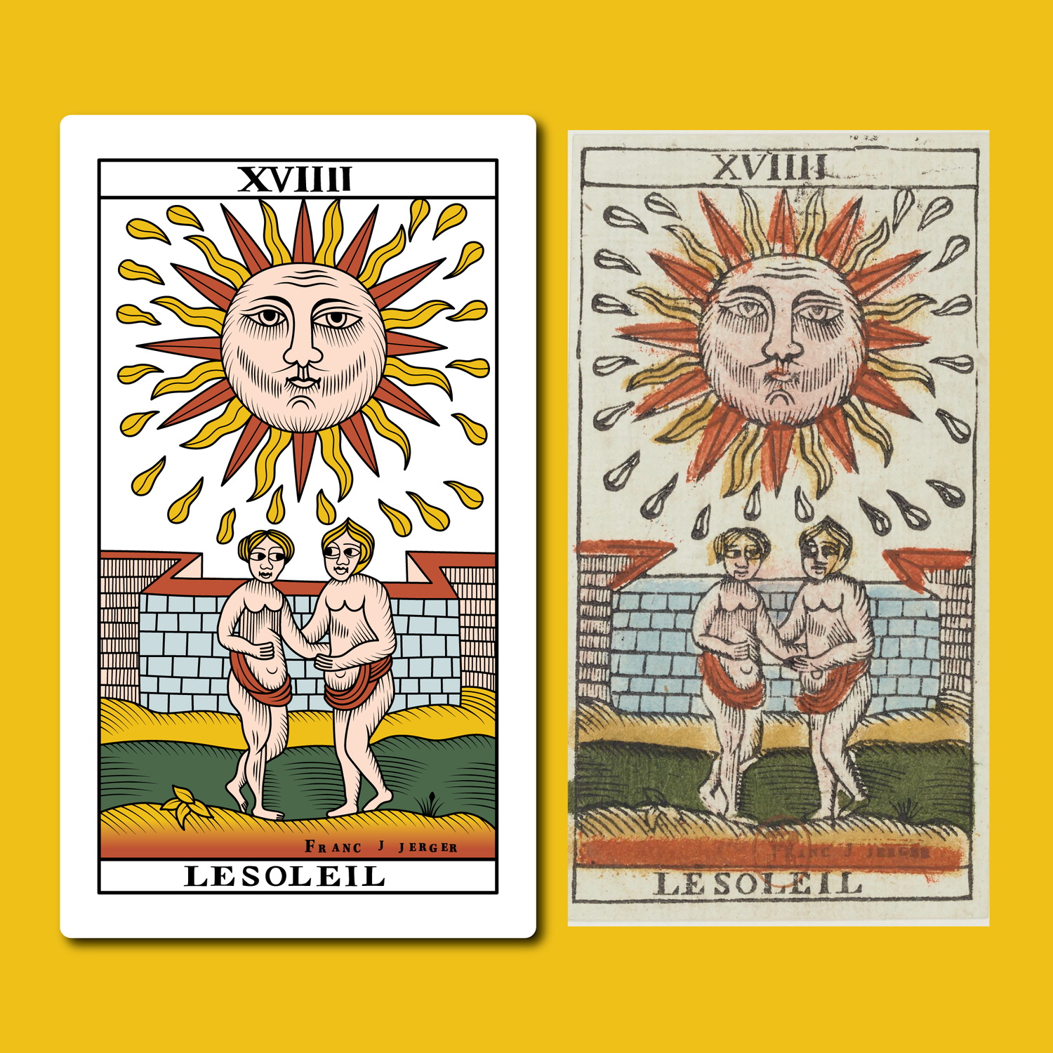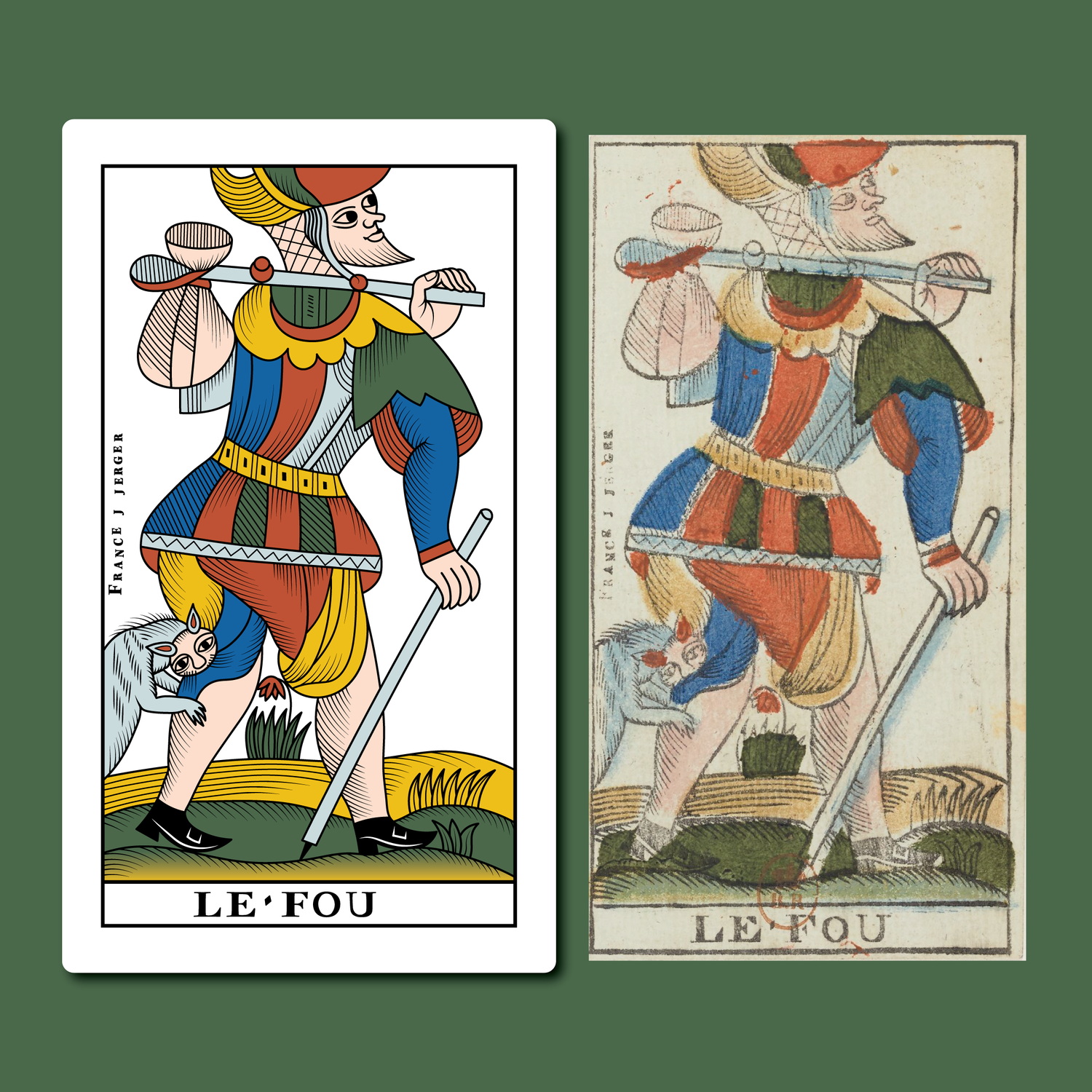 This restoration is based on the 1820-1845 tarot deck created by German-born master cartier Jacob Jerger in Besançon, France. The original decks were printed from carved woodblocks and colored with stencils.