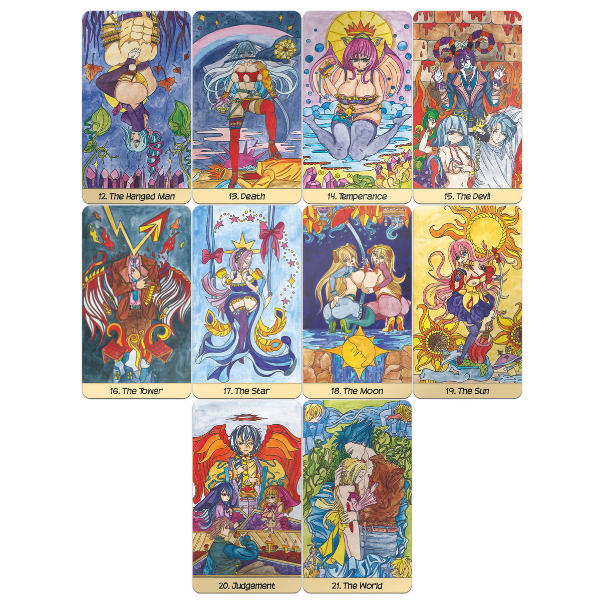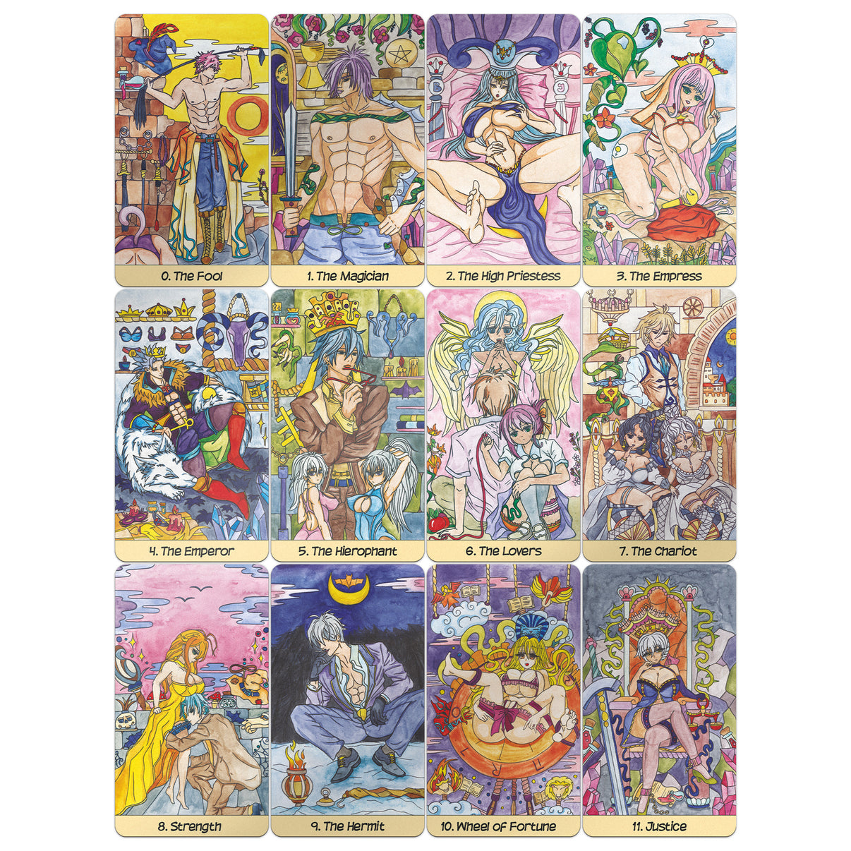 The Major Arcana images are characterized by light eroticism, which is hardly ever present in the hentai style. Moreover, you can recognize many objects and plots from the classic tarot of A.E. Waite.