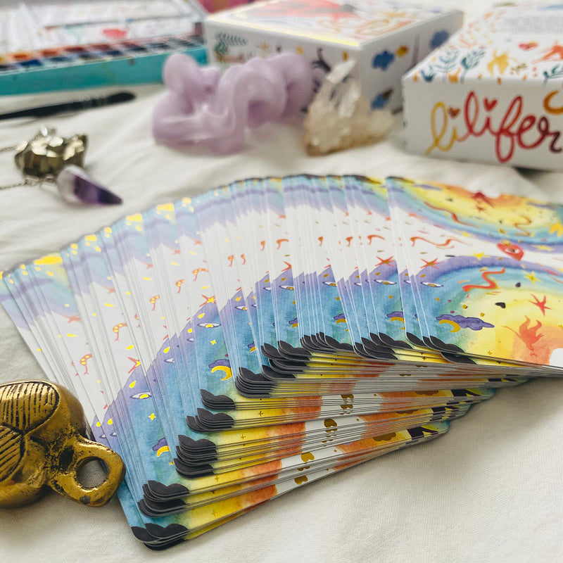 Every illustration was intuitively painted by hand with watercolors. Lilifer is a free-flowing deck with a unique voice. It takes root in various forms of the tarot and isn't attached to a specific school of thought.