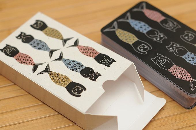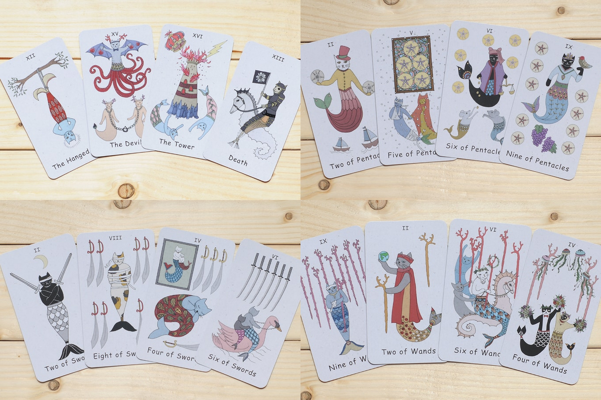 I initially created this deck for myself, because I couldn't find one that spoke to me. Since the right deck for me wasn’t on the market, I decided I’d have to create it for myself! Why mermaid cats? I've been doodling these imaginary creatures for a few years, because I love and live with cats and tropical fishes. I realized that I had been developing my own visual language for oracular interpretation.