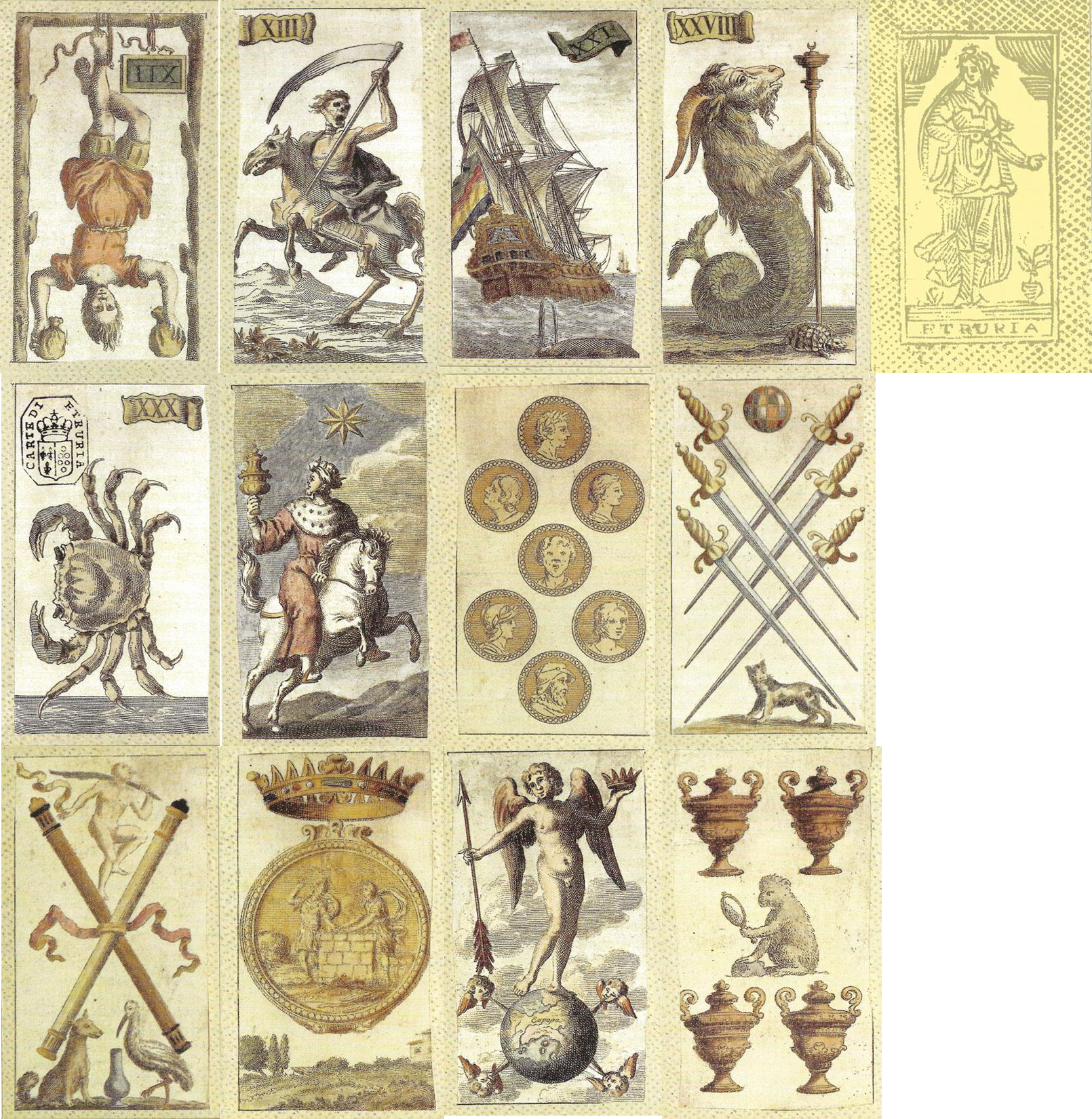 The “Minchiate Etruria” deck was originally published in Florence around 1725, printed from copper plate etchings and hand coloured with water colours. Minchiate was a late-medieval card game employing a specially extended pack of 97 cards, related to Tarot but including 12 zodiac signs, 4 virtues (faith, hope, charity, prudence) and 4 elements (fire, water, air, earth). Some scholars believe that these cards may have served as teaching aids, because several trump allegories (Virtues, Elements, Zodiac signs) belong to categories upon which classical learning was based at that time.