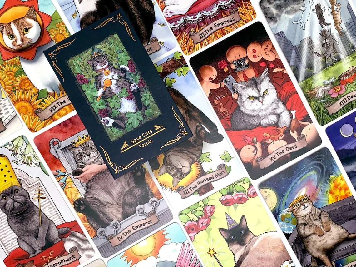 每張卡牌都是根據我們真實救助的流浪貓形象再將塔羅牌面含意與貓咪真實經歷與特徵結合繪製而成。最特殊的一張牌是死神牌,這張牌既象徵結束也象徵開始,四隻花貓代表已經離開的四隻小貓,如果真的有貓星球,希望牠們這次不要再遭受這麼多痛苦。