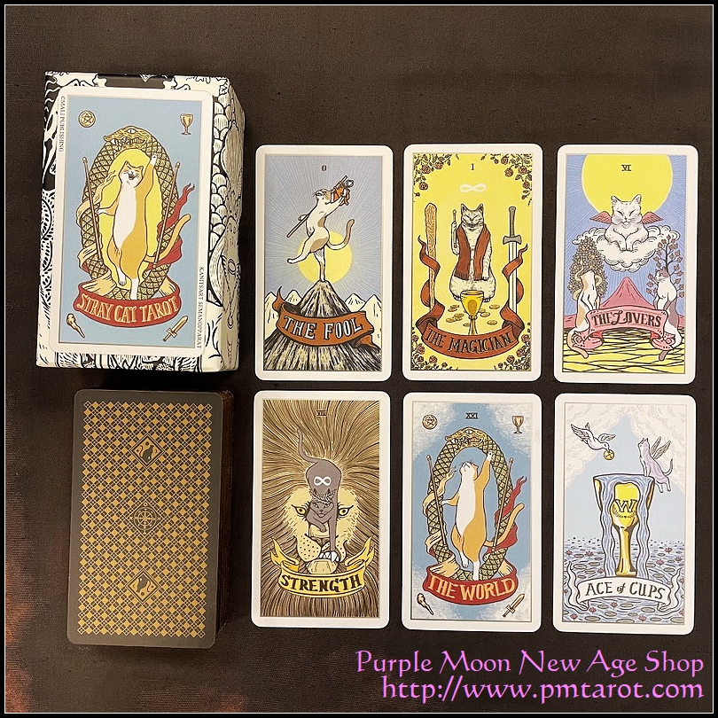 很多人說貓咪總是會在不經意的時候,做出神奇的伸展,這次在流浪貓塔羅牌裡,就能看到這些可愛的姿勢喔!流浪貓透過自己在日常中的經歷,狂喜的演出。搭配上與畫面中融為一體的歐風緞帶,上面結合了作者手繪的字體,巧妙的傳遞出一種復古優雅的懷舊感,將偉特系統中的元素重新解構再組合,安排在牌卡中的不同位置上,除了使用在占卜上能一目了然外,很多場景 也讓人有會心一笑的體會,可說是讓初學者又多了一個入門牌的好選擇!