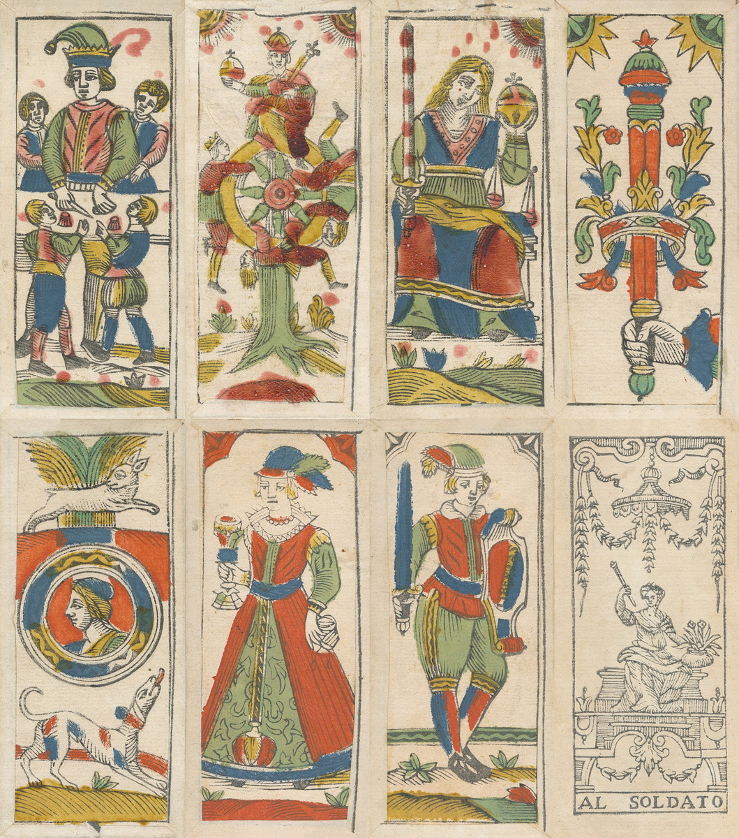 一個非常罕見的塔羅奇牌,「Al Soldato」以四個摩爾人的插圖代替女祭司、皇后、皇帝和教皇。與來自博洛尼亞的其他塔羅奇一樣,這套牌有 62 張牌卡。