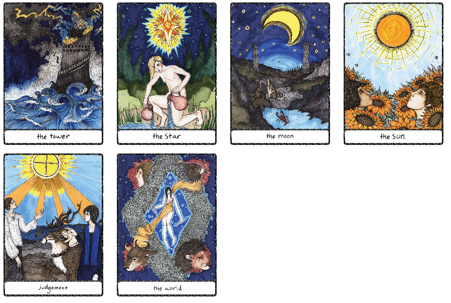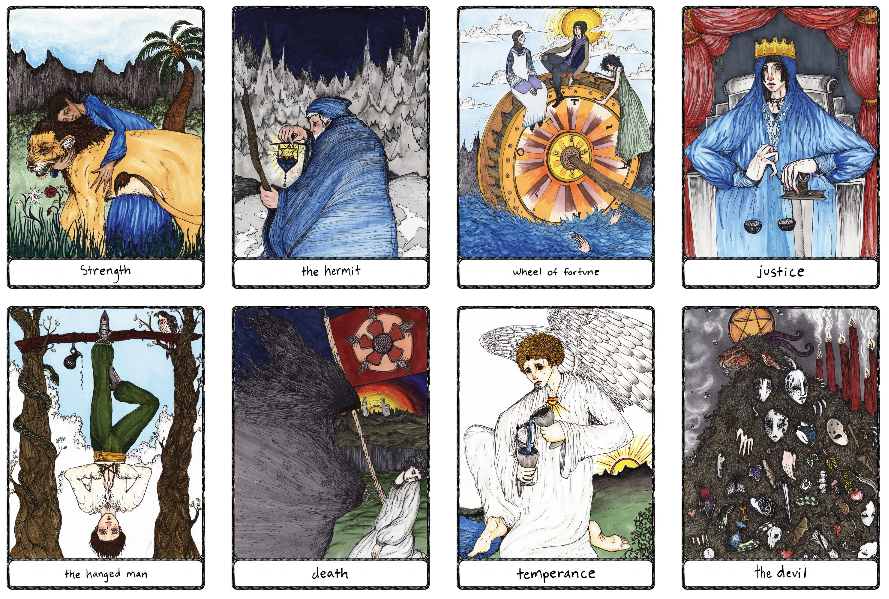 The Efflorescent(形容詞:綻放花朵)塔羅牌歷時兩年(2009 年至 2011 年)製作而成,是一套功能齊全的牌組,以 Rider-Waite 傳統進行闡釋。這套牌由存在於他們自己的世界中的人物、物體和地點組成,是對原型和超越人格的實體的檢驗。這些紙牌之所以強大,是因為它們成為人類戲劇的參與者。它們是個人真相的觸發因素。與所有神話和寓言一樣,這些卡牌在現實世界和室內景觀之間提供了一個邊緣空間。它們成為愛、失去、艱辛、回報的寓言;它們讓人們在符號和故事中看到自己的道路。