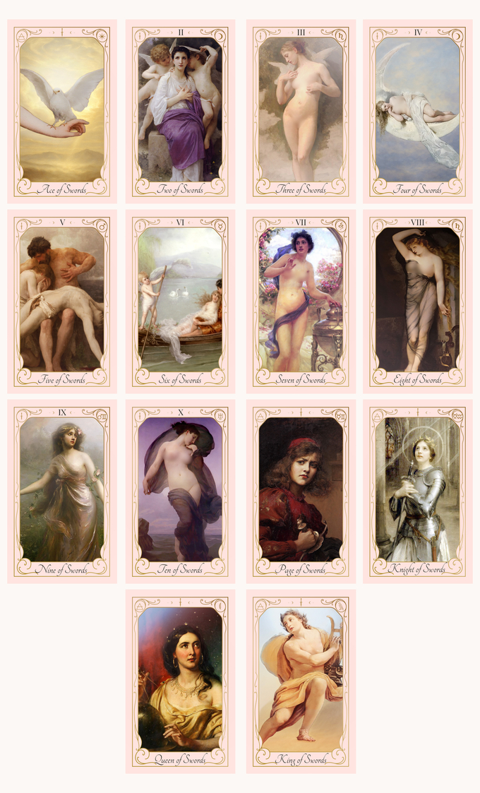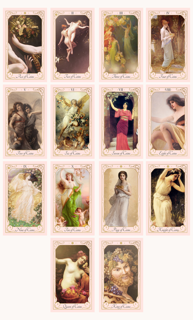 這副牌的創作源於藝術修復與數位拼貼,作者在 Photoshop 中手工逐層編輯,融合稀有藝術作品、拼貼場景與重繪背景,加入光影與天體元素,直到每張牌「說話」。牌中的意象致敬愛神阿芙蘿黛蒂(Aphrodite)、維納斯(Venus)、愛神(Amor)與海神女(Amphitrite)等女性神性原型,但不強調宗教崇拜,而是以藝術與柔軟的力量作為靈性映照。