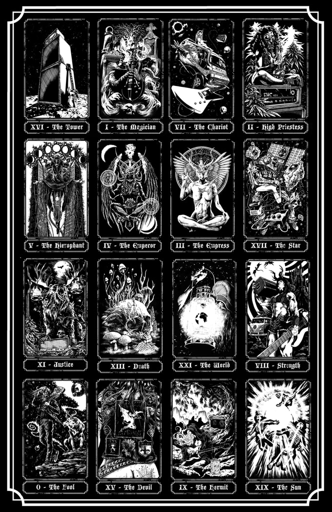 本產品需要付全數訂金訂貨,一般需時約 3-4 星期到貨。The Hand of Doom tarot. A 78 card tarot deck based on the classic Rider-Waite arcana but featuring brand new Doom Metal and Dark Fantasy themed artwork. Guitars and amps compete with monsters and magic to determine your fate. Tattoos and Fae, Werewolves and Whiskey, Science Fiction mixed with Sorcery. Saddle up a Chopper or saddle up a Dragon, spark one with a Goblin, lay down some tracks in the upper atmosphere with a Supernaut. Pure 70s Pulp is represented in each card. Follow the smoke to the riff filled land.