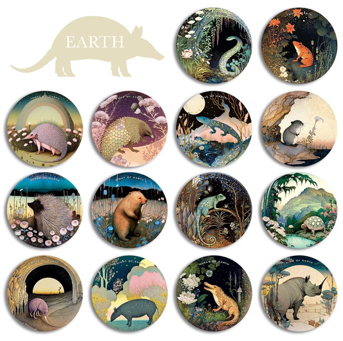 Round tarot cards with endangered or extinct animals, depicting correspondences that not only reflect the traditional meanings of the tarot cards but also pay homage to the unique characteristics and stories of these endangered or extinct animals, adding a layer of depth and awareness to the tarot reading experience.