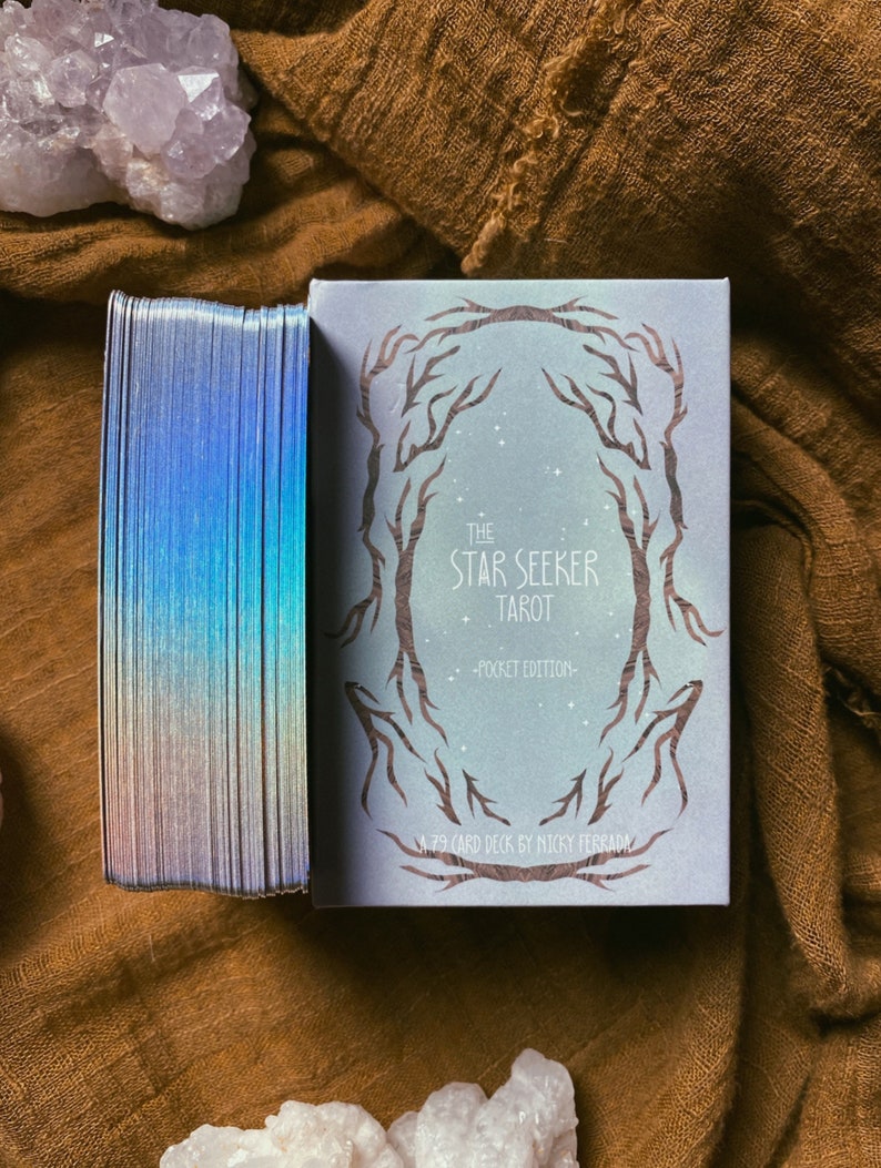 The Star Seeker Tarot Pocket Edition is a 79 card deck, created to guide you on your journey towards connection, healing, intuition... and even guidance for your every-day! This is a whimsical interpretation of the classic 78 card tarot deck, with a special bonus card. The artwork and number of cards is the same as the standard version of the deck.