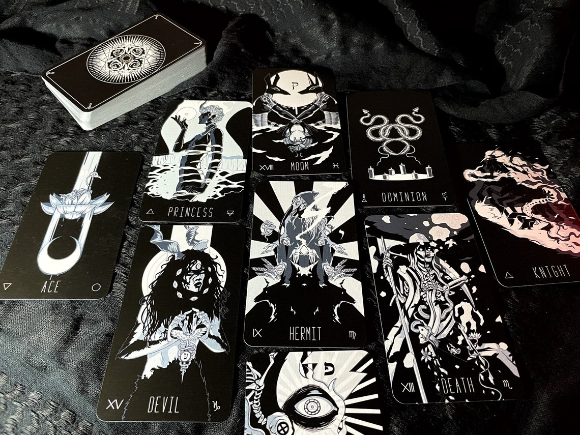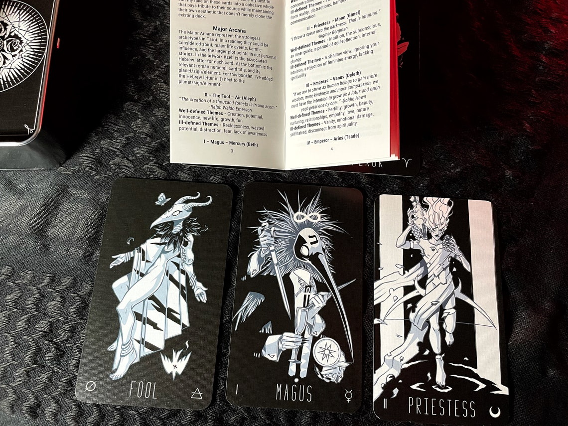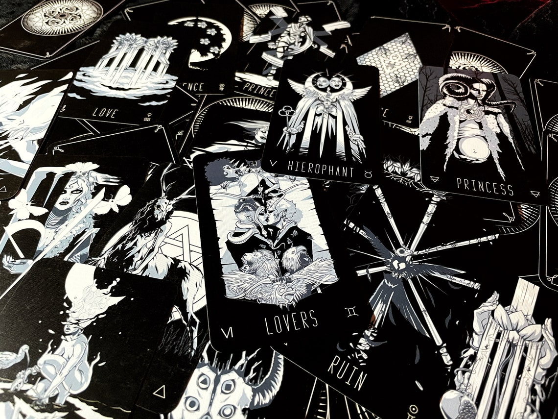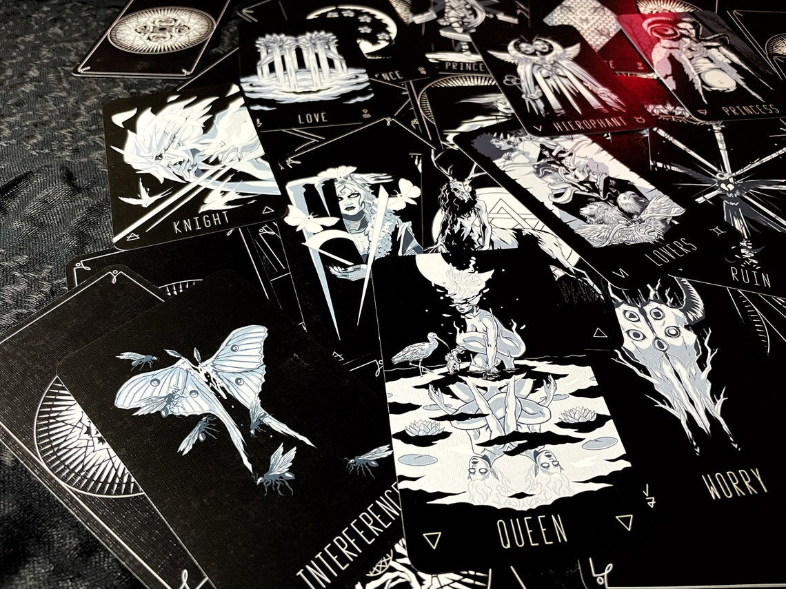 In the imagery of the Wayward Dark Tarot are the archetypes and symbolism of Aleister Crowley’s Thoth Tarot deck, mirrored and modified into a chthonic afterlife evoking the beautiful and the macabre. Each of the seventy-eight Tarot cards has been painstakingly researched and lovingly drawn. The deck has a limited palette of whites and blues on top of black backgrounds, giving every unique card a consistent look with the rest of the deck.