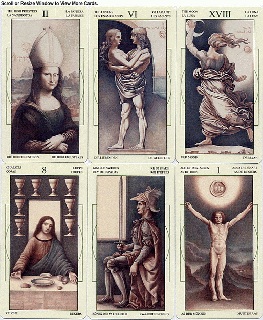 這副牌是唯一一副根據 Da Vinci 的塔羅,有很多有關 Da Vinci 的圖案,由於色調較淺,所以看上去會有種歷經風傷、古典的感覺。有很多張牌的圖案都是基於一些偉大的、深奧的藝術品。