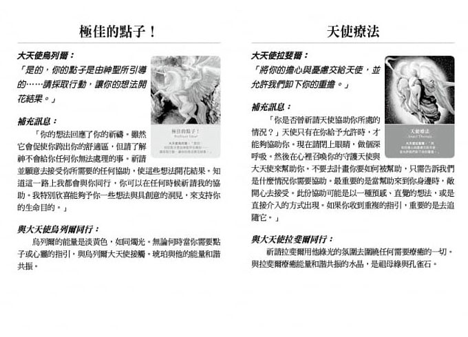 指引手冊上詳述每位大天使的作用與大天使名字的意義,以及每位大天使的氛圍顏色和相對應的水晶,幫助我們認識大天使。