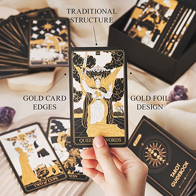 Black and gold tarot deck with guide book and box with gold foil tarot design details. Each card`s front & back has unique gold foil elements, glossy gold edges, and luxe cardstock with a matte finish