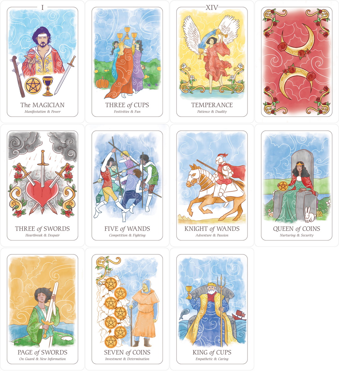 Based on the familiar Rider-Waite® artwork, Simplicity Tarot presents uncluttered and uplifting watercolor imagery that helps readers focus on core meanings and concepts. Created with the beginning tarot learner in mind, this charming deck features keywords on the card faces for easy reference. The 100-page guidebook introduces readers to upright and reversed meanings and provides clear instructions for several card spreads. The 80 glitter gilded card deck includes two bonus cards and has glitter gilt edges.