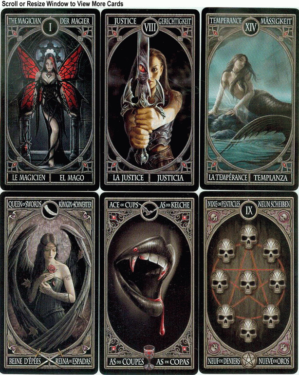 These cards evoke a darkly romantic realm dominated by dragons, fairies, fallen angels and other nocturnal creatures. You will rediscover, surrounded in darkness, the traditional structure of a Tarot deck in which even the minor Arcana are richly illustrated.