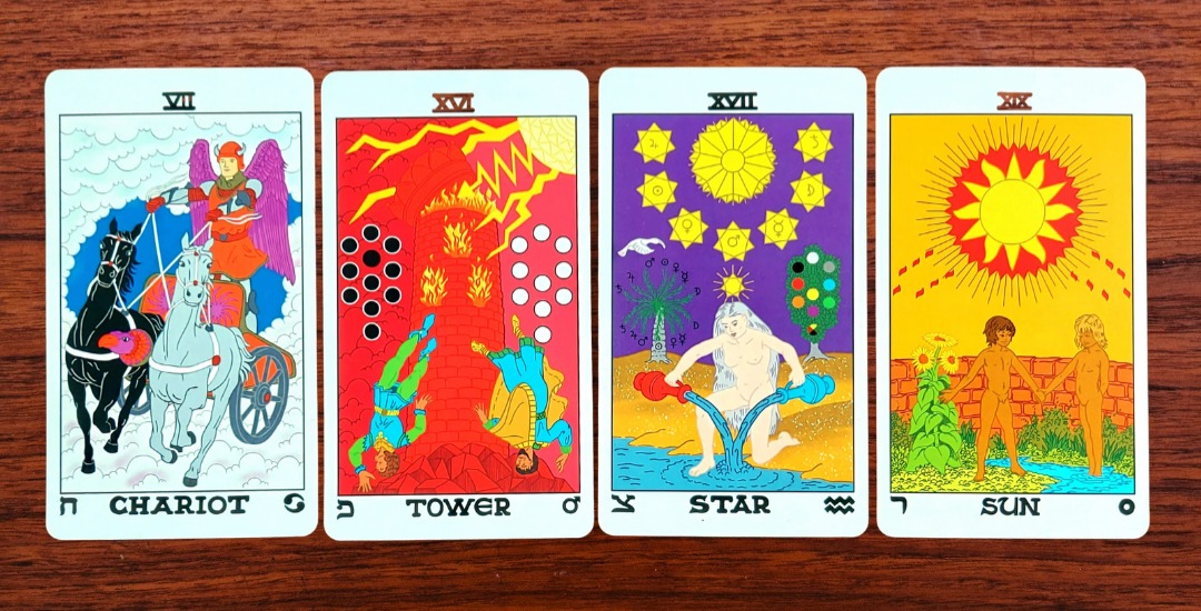 The colouring used in this Golden Dawn/Stella Matutina tarot deck is unique and is based on the four sets of Golden Dawn colour scales.