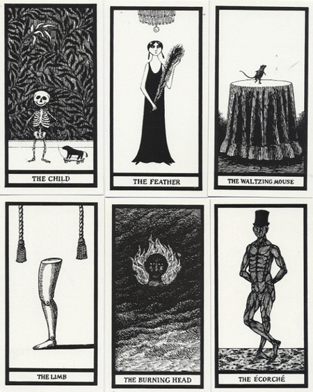 Edward Gorey's trademark sense of impending doom is nowhere more darkly humorous than in this, his version of a tarot card deck. Each of the 20 cards forecasts a list of outcomes for the user ranging from the merely unpleasant (loss of hair, breakage, thwarted ambitions) to the downright horrible (catarrh, spasms, shriveling). The 32-page booklet provides interpretation of the cards courtesy of one Madame Groeda Weyrd, who Gorey tells us 'is of mixed Finnish and Egyptian extraction, has devoted her life to divination, and is the author of, among a shelf of other works, Floating Tambourines, a collection of esoteric verse, and The Future Speaks Through Entrails.' Who but Gorey to make mirth from a kaleidoscope of catastrophe?