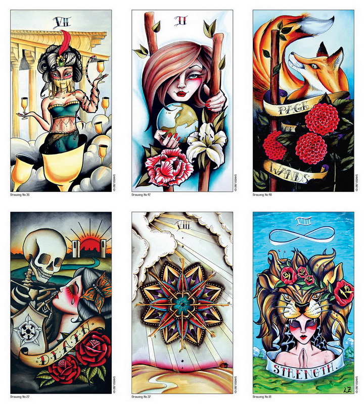 This vividly illustrated deck follows the artistic development of tattoo artist and designer Lana Zellner. The 82-card deck includes all of her original tarot art plus four new cards painted specially for this edition. The cards feature art forms and iconic imagery from both tattoo and tarot traditions, all hand drawn and painted using the watercolor painting style of “spitshading.”
