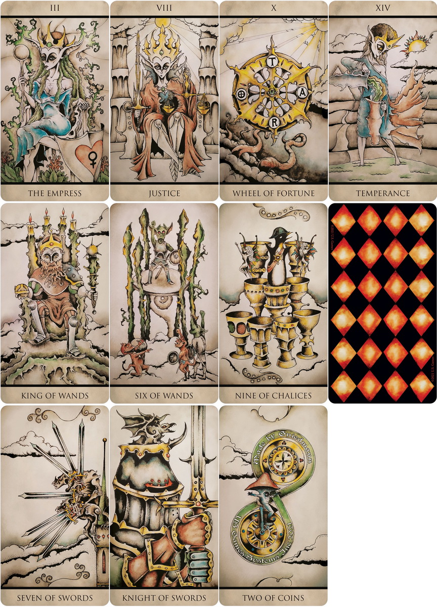 本產品需要付全數訂金訂貨,一般需時約 3-4 星期到貨。The faraway town of Nuages, in the land of clouds, has its own culture, creatures, traditions and tarot. Tarot Nuages pays tribute to Marseilles-style tarot with some antique elements, but it also embraces a modern, playful spirit with goblins, penguins, pixies, gargoyles and animated mushrooms inhabiting the Minor Arcana. The Major Arcana introduces a pantheon of demigods and high-powered personalities that will lead readers through an unforgettable tarot journey. Includes 79 cards and 64-page booklet.