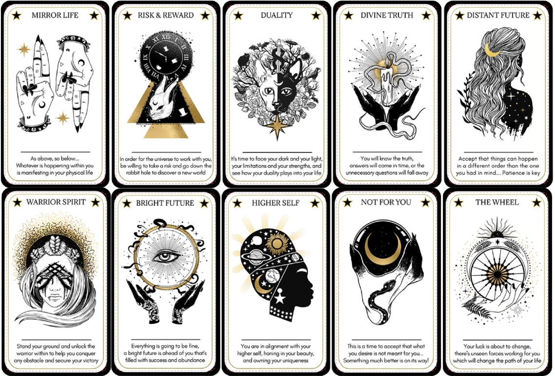 Can be used in conjunction with tarot cards, other oracle decks or simply on their own.