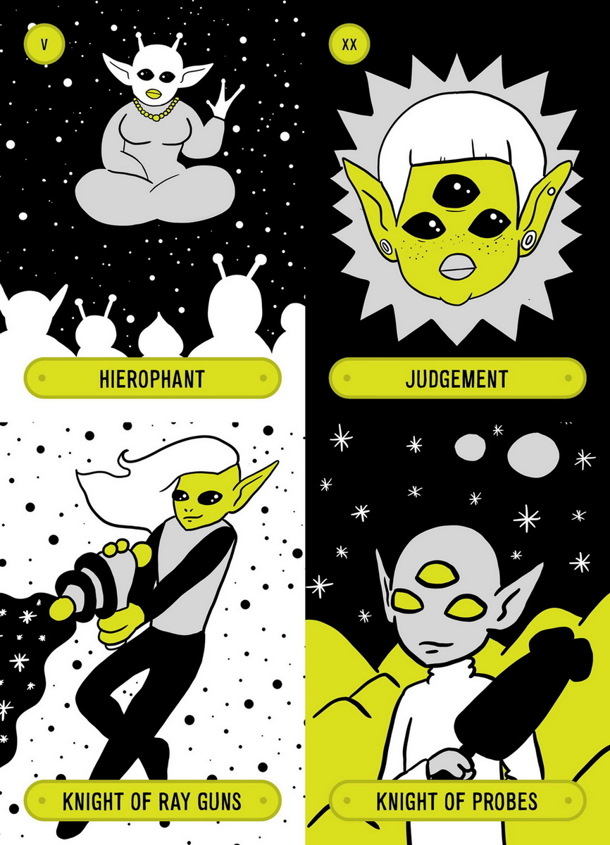 Full of alien probes, ray guns, test tubes, and UFOs, this deck follows the traditional 78-card structure, with some small, mischievous changes. The suits have been swapped out to include ray guns, specimens, disks, and probes.