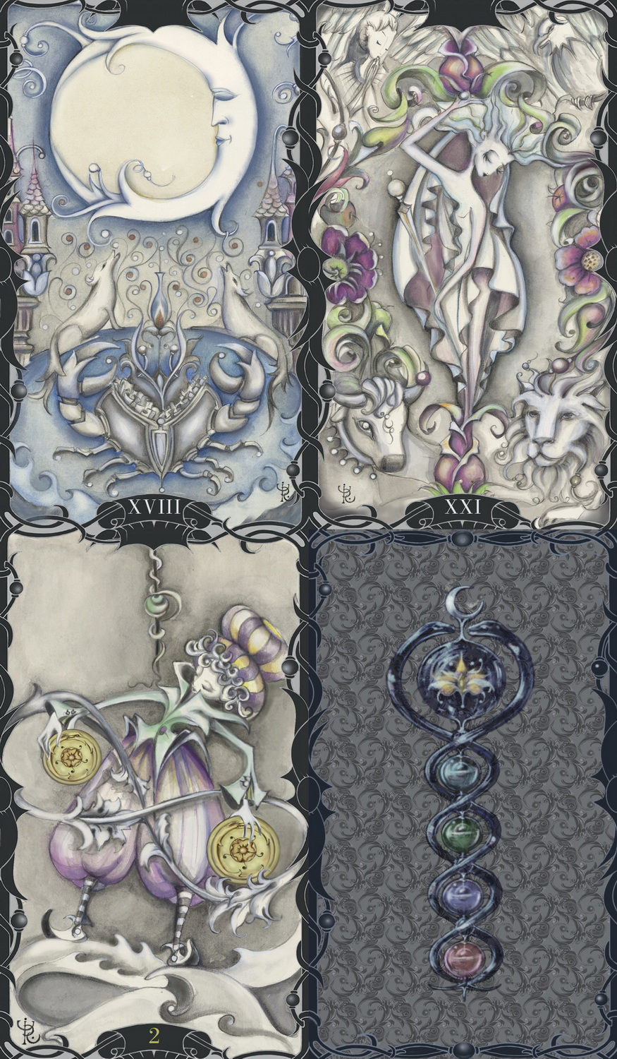 Curvy, sinuous lines, an elegant silver palette, fairy-like dancing creatures in a quirky Tim Burton setting: the Tarot of the Enchanted Garden has a unique and mysterious atmosphere that inspires curiosity and sparks the magic within you. This deck is an invitation to a fabulous ball in a faraway land. Will you join the dance?