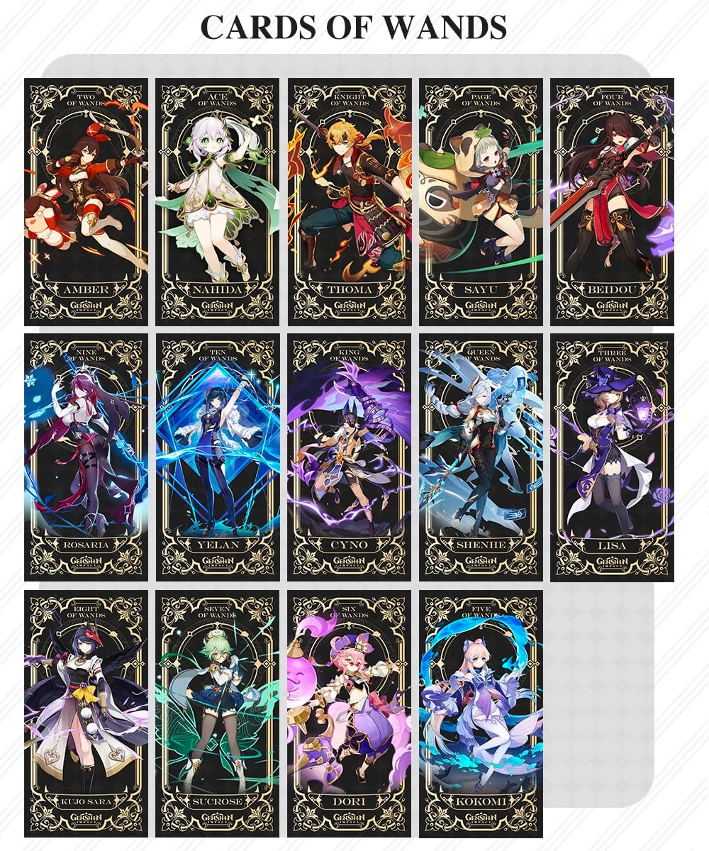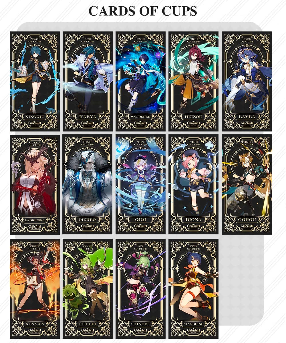 We combine the Genshin Impact characters with tarot cards. This set of genshin cards will contain a large number of characters from Mond to Sumeru, even including eleven fatui harbingers. If you are a genshin lover, this Genshin impact cards set will be very worthy of your collection.