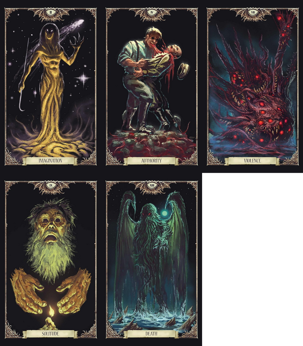 Original art: featuring 78 cards and a 128-page booklet with custom necronomicon-inspired illustrations and never-before-seen artwork featuring cthulhu, yog-sothoth, and the other dark denizens of lovecraft’s fictional grimoire