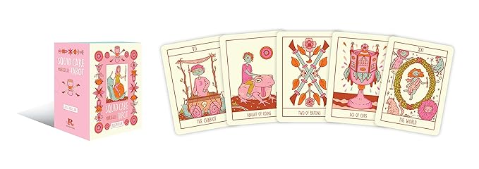本產品需要付全數訂金訂貨,一般需時約 2-4 星期到貨。Filled with snails, cakes, fly-traps, and octopus, this deck is a modern and colourful twist on the traditional Tarot de Marseille. The Squid Cake Marseille is a 78 card deck where you'll discover Knights riding creatures, quirky faces and a delicious colour palette! Bring a little light-heartedness to your readings while dishing out the cold hard truth... with a side of humour! Regardless if The Chariot is being pulled by two snails instead of horses, or The Hierophant is giving advice to two pink birds rather than people, the message is still the same.