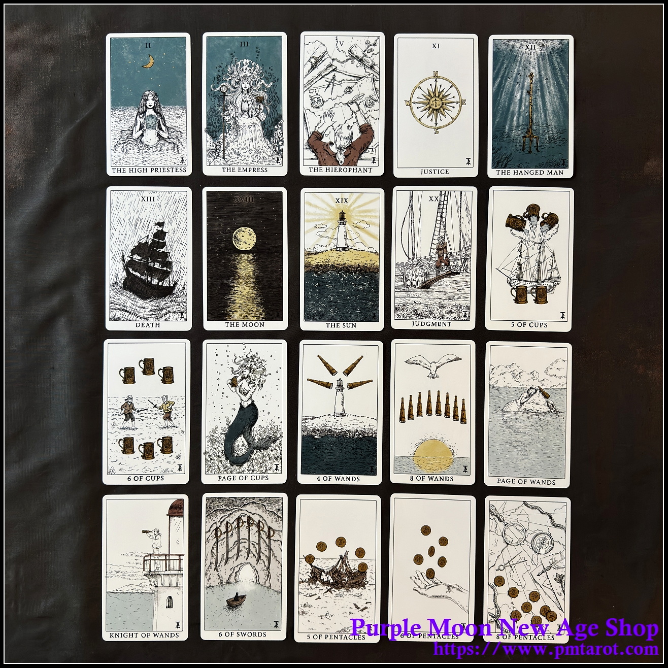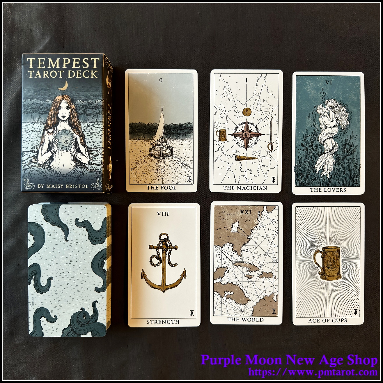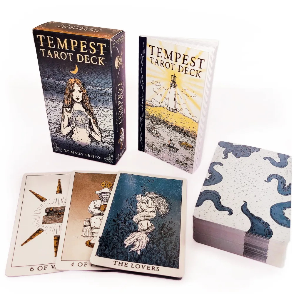 Tempest Tarot 邀請你踏上航海冒險之旅,探索海洋領域的奧秘和秘密。當你冒險越過淺灘,到達了深海,挑戰你去尋找內心真理的寶藏時,你會發現你的視角正在轉變。神話中的海洋生物、活潑的海盜和迷人的美人魚幫助你在 78 張塔羅牌中探索新視野。