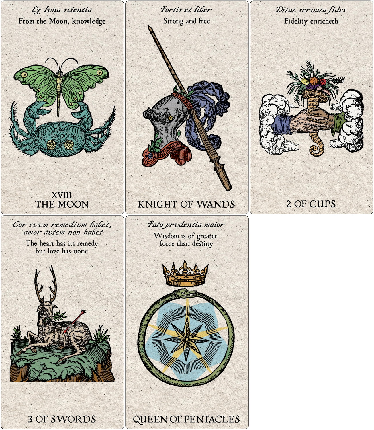 Among the many ancient and iconic images this deck portrays—plumes, helmets, swords, gemstone rings, coins, wands, clouds, wreaths, flowers, animals, and trees—Roland sees the evolution of tarot’s wands, swords, cups, and coins, as well as evocative glimmers of the Major Arcana archetypes. Both secular and religious, Renaissance emblems were meant to crystallize virtue or vice and cover every sphere of early modern knowledge: ethics, natural philosophy, politics, science, religion, love, war, and everyday life, very much in the same way that modern tarot imagery provides insight and clarity today.
