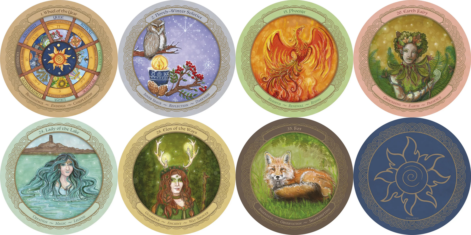 - 45 Round Cards: Feature colorful hand-drawn artwork of natural elements and mystical symbols, with evocative keywords, printed on premium card stock